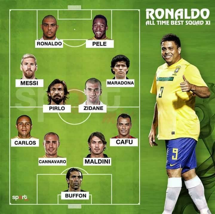 | 先睇前鋒,朗拿度揀自己絕對合理,唔係話佢偏幫自己,客觀黎睇佢絕對係前鋒線上嘅不二之選。而另一位前鋒,「大哨」揀選巴西前輩比利,既然被稱為球王,比利當然值得入選,更加唔好講佢同朗拿度係同鄉。 | |